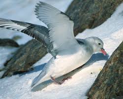 Los petreles , pardelas y fulmares constituyen una familia próxima a la de los albatros. Este es uno de los más pequeños ,y es blanco con el pico y los ojos negros. Anida en los picos de las montañas.